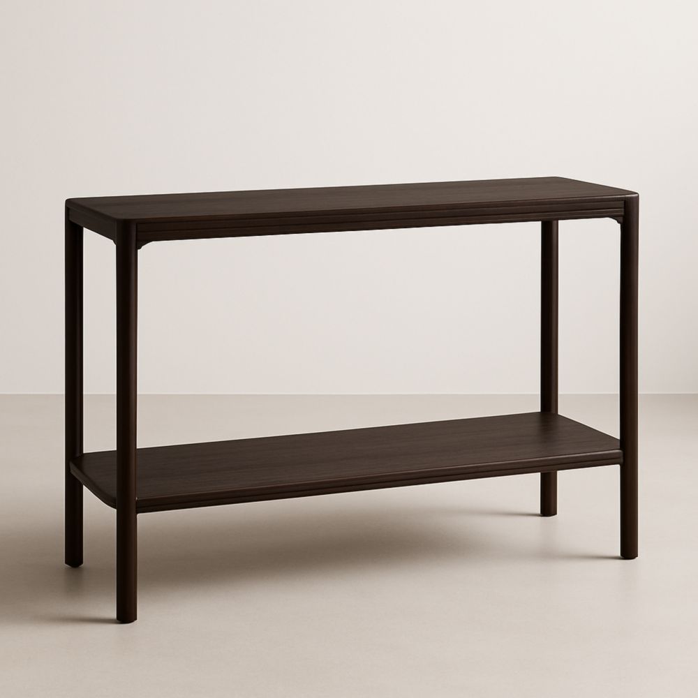 Consolle rettangolare in legno di colore marrone scuro con ripiano inferiore