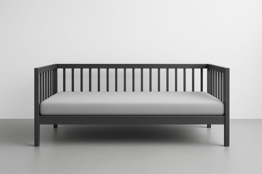 Divano letto in legno di faggio massello con finitura antracite. Include materasso con rivestimento in poliestere grigio. Dimensioni: lunghezza 200 cm, profondità 90 cm, altezza 80 cm.