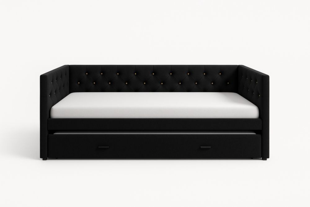 Divano Letto Nero in Legno e Poliestere con Cassetto